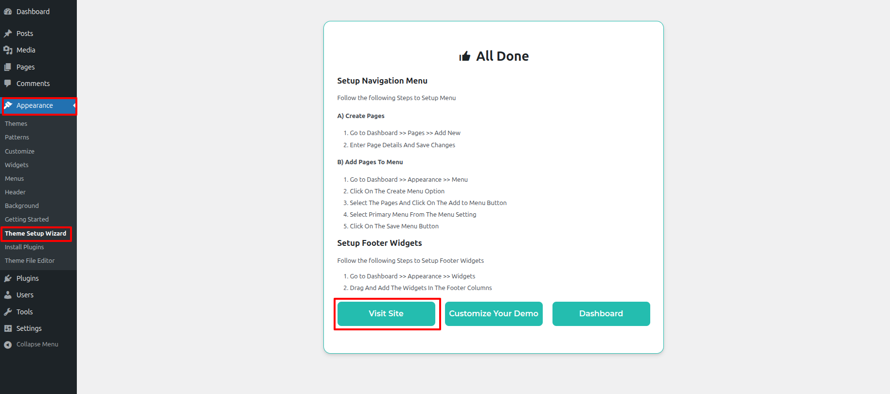 - Hit up the the Dashboard > Appearance > Theme Setup Wizard