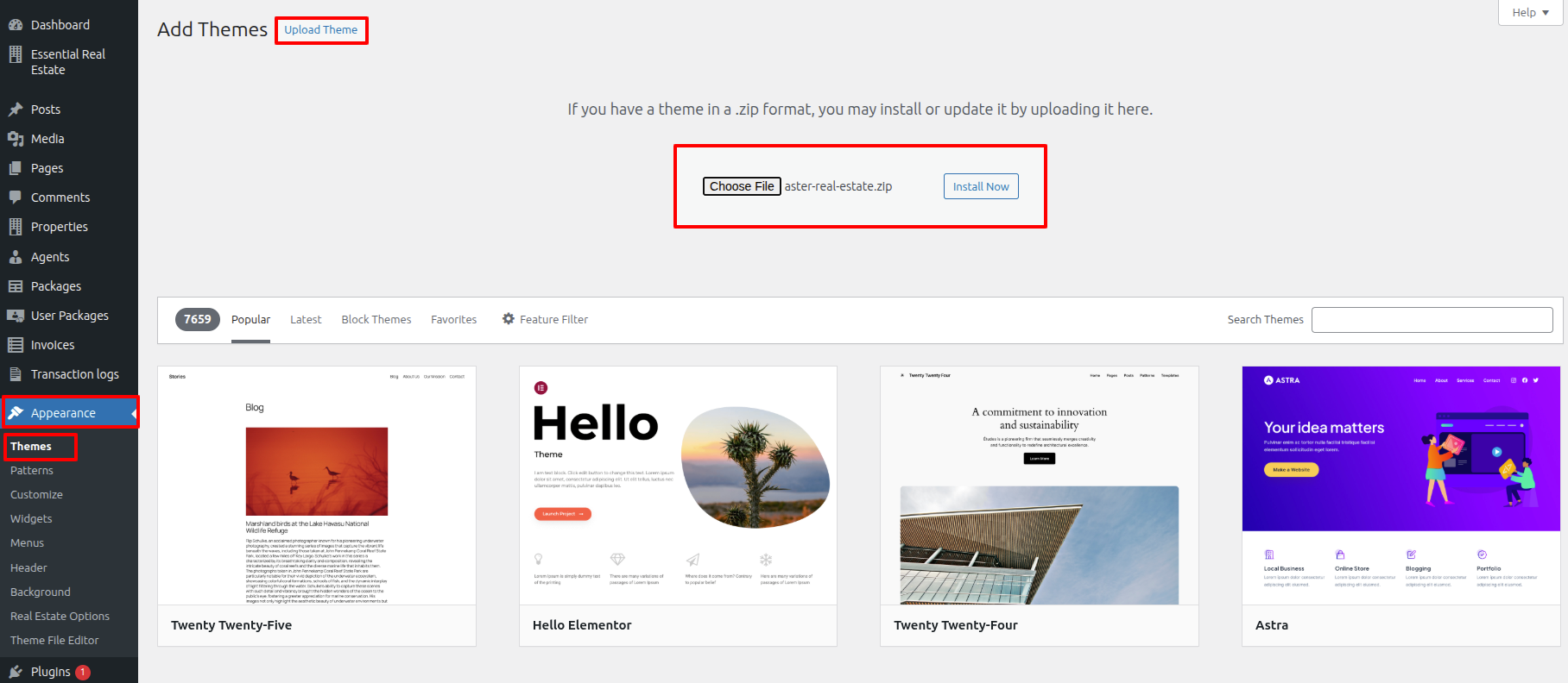 - Click the Upload Theme Tab if you have a theme file in ZIP format and Simply tap the Browse for chosse file in ZIP format and then click Install Now.