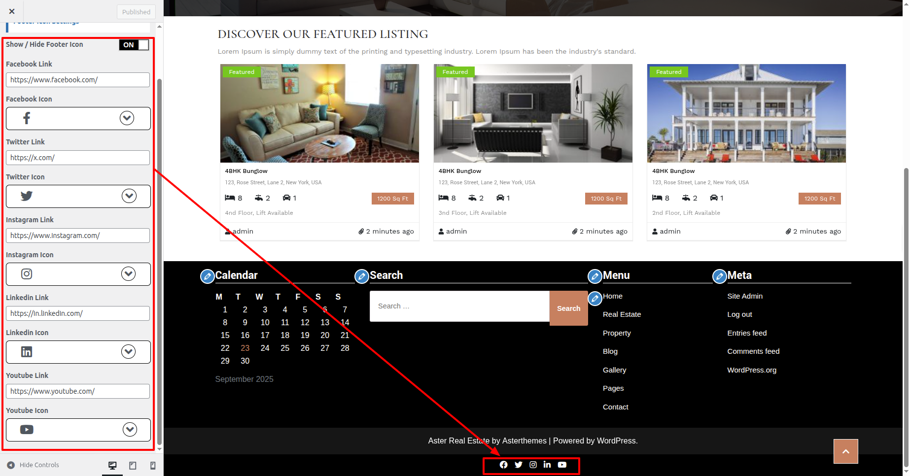 - Hit up the the Dashboard > Appearance > Customize > Theme Options > Footer Social Icons.