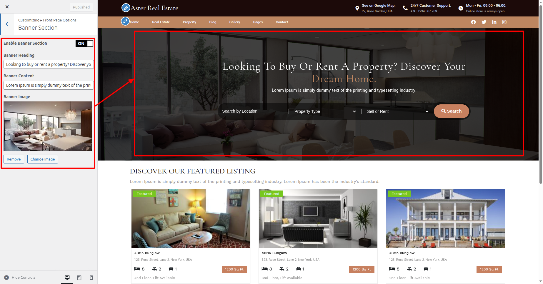 - Hit up the the Dashboard > Appearance > Customize > Front Page Options > Banner Section.