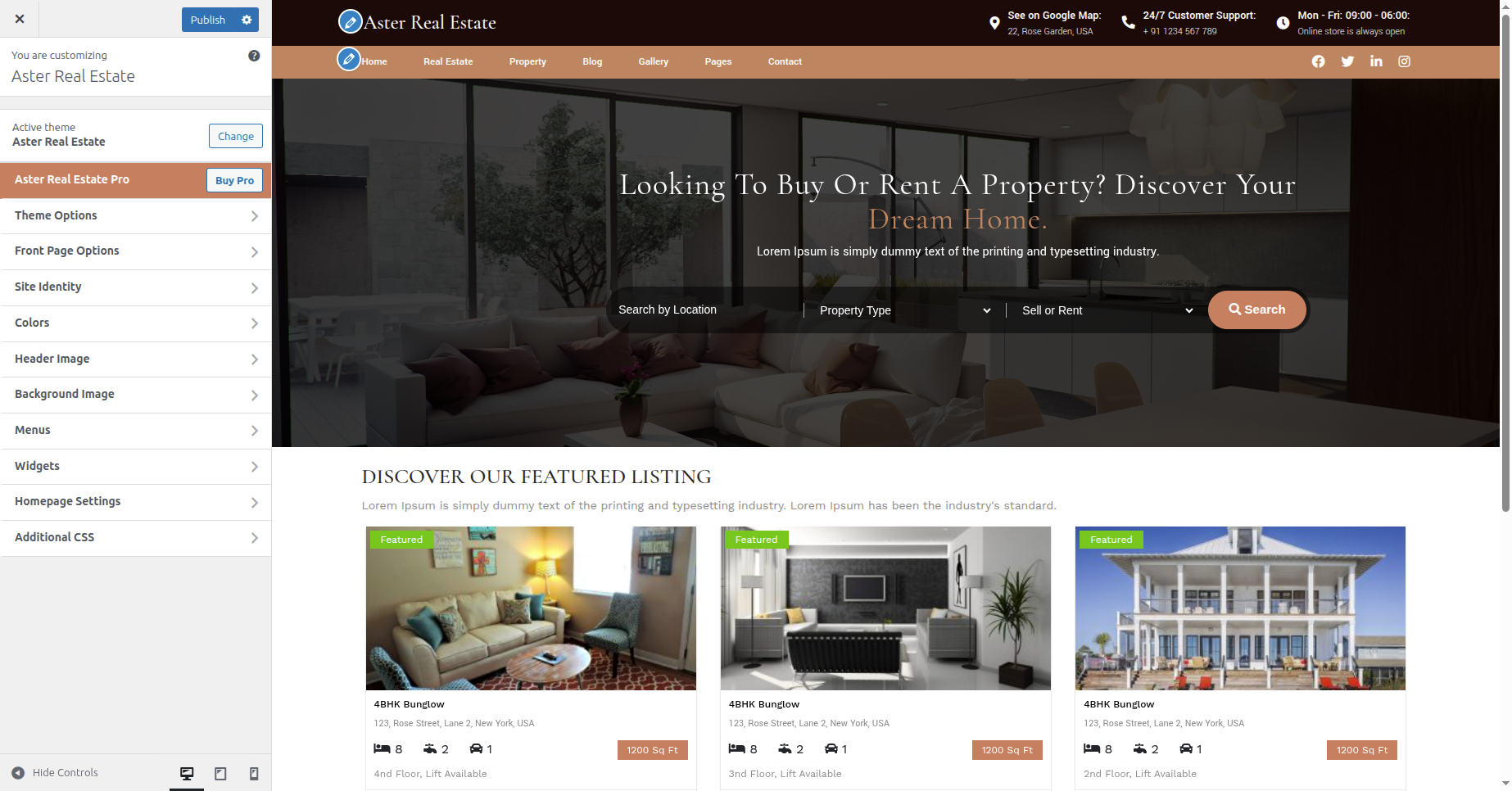 - Hit up the the Dashboard > Appearance > Customize > Front Page Options > Properties Section.