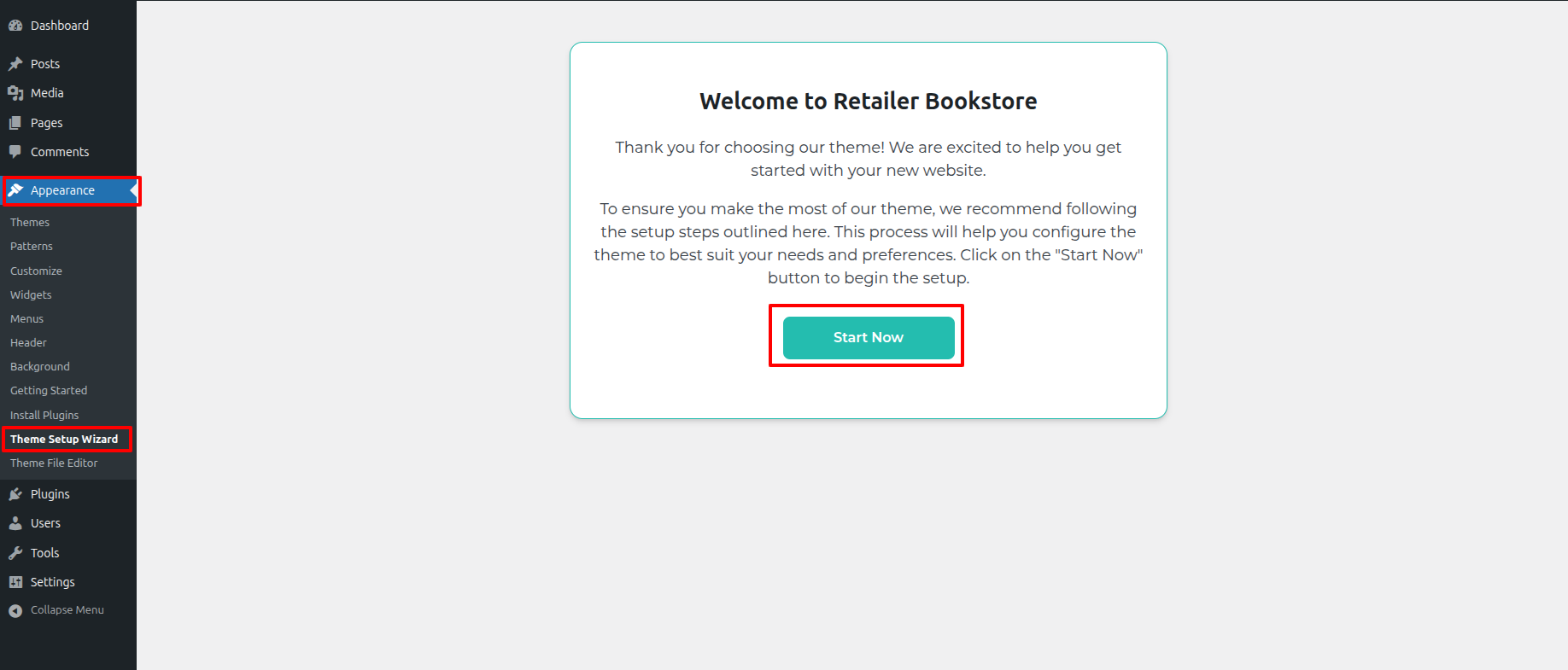 - Hit up the the Dashboard > Appearance > Theme Setup Wizard