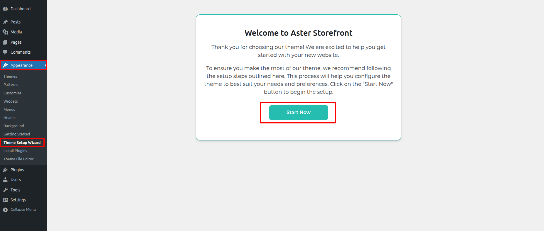 - Hit up the the Dashboard > Appearance > Theme Setup Wizard