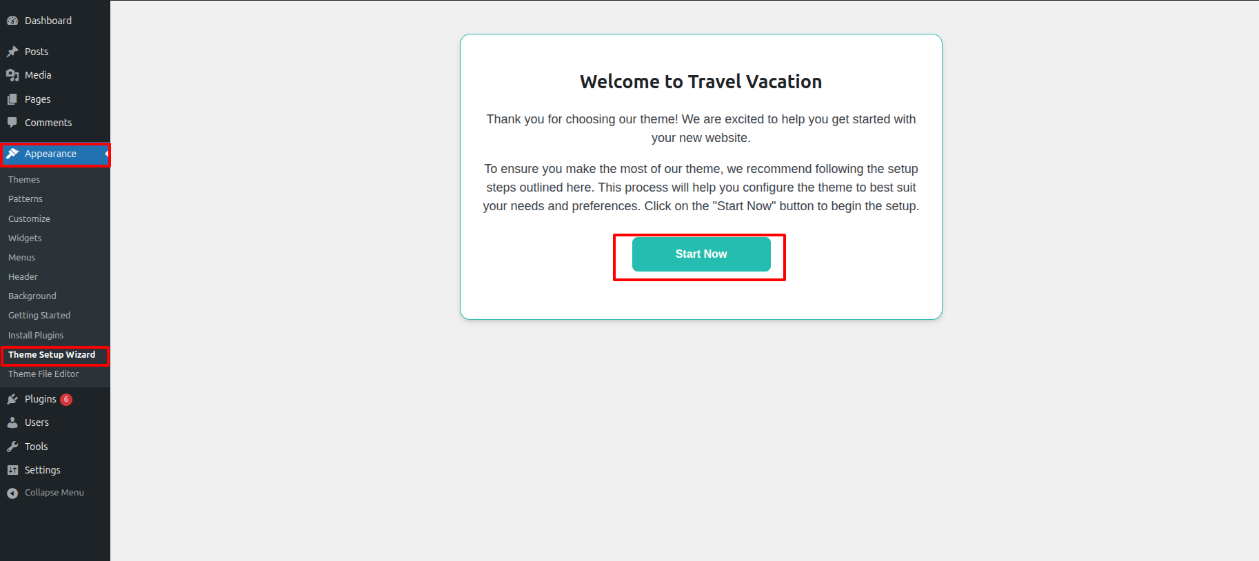 - Hit up the the Dashboard > Appearance > Theme Setup Wizard