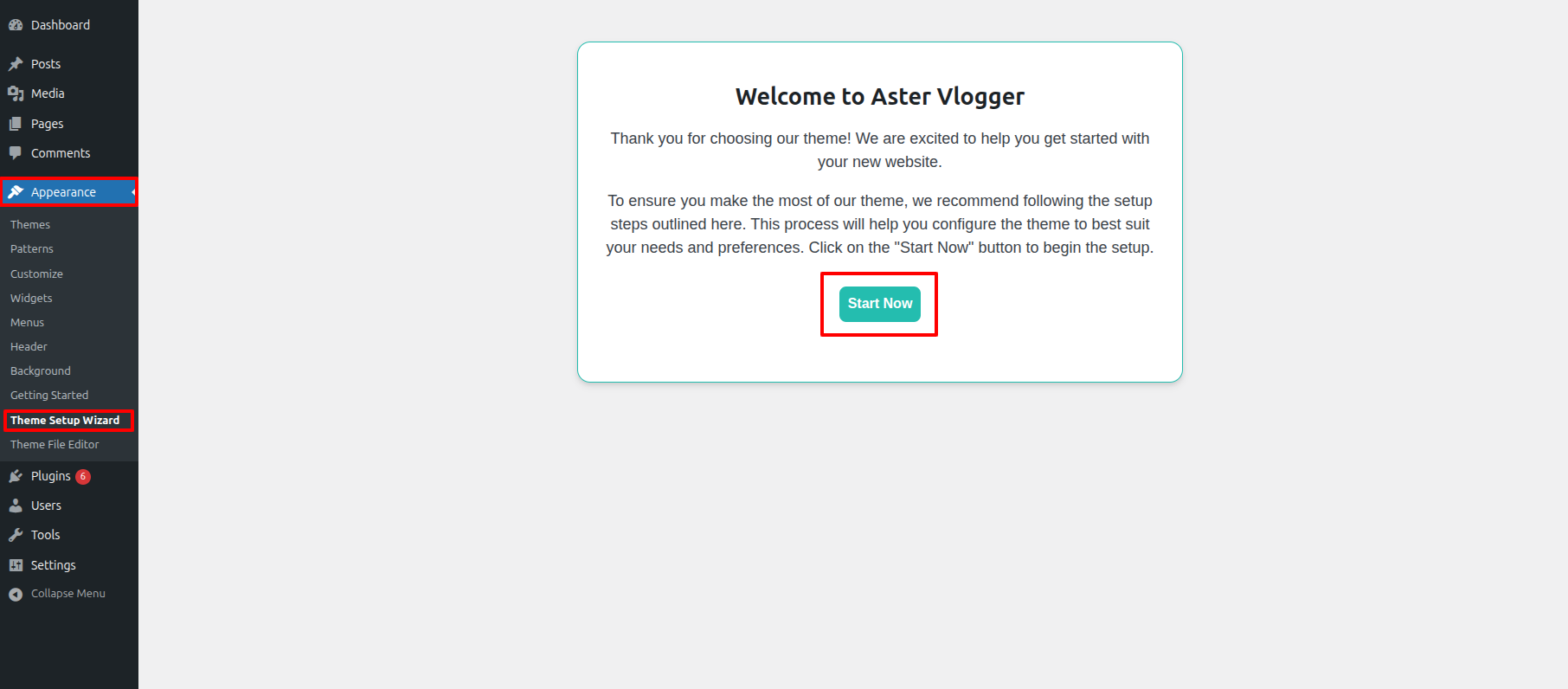- Hit up the the Dashboard > Appearance > Theme Setup Wizard
